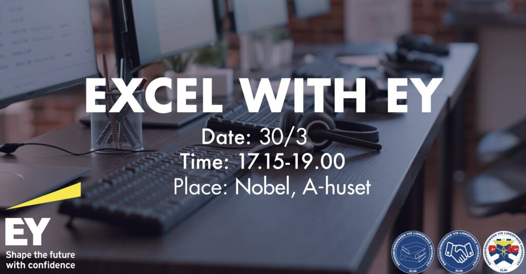 Den 30 mars kl. 17.15 har ni möjlighet att vässa era kunskaper i Excel tillsammans med EY. Under kvällen går de igenom grundläggande tekniker som ni kan ha nytta av både i studierna och i arbetslivet. Inga omfattande förkunskaper krävs. EY bjuder dessutom på sushi till alla deltagare!